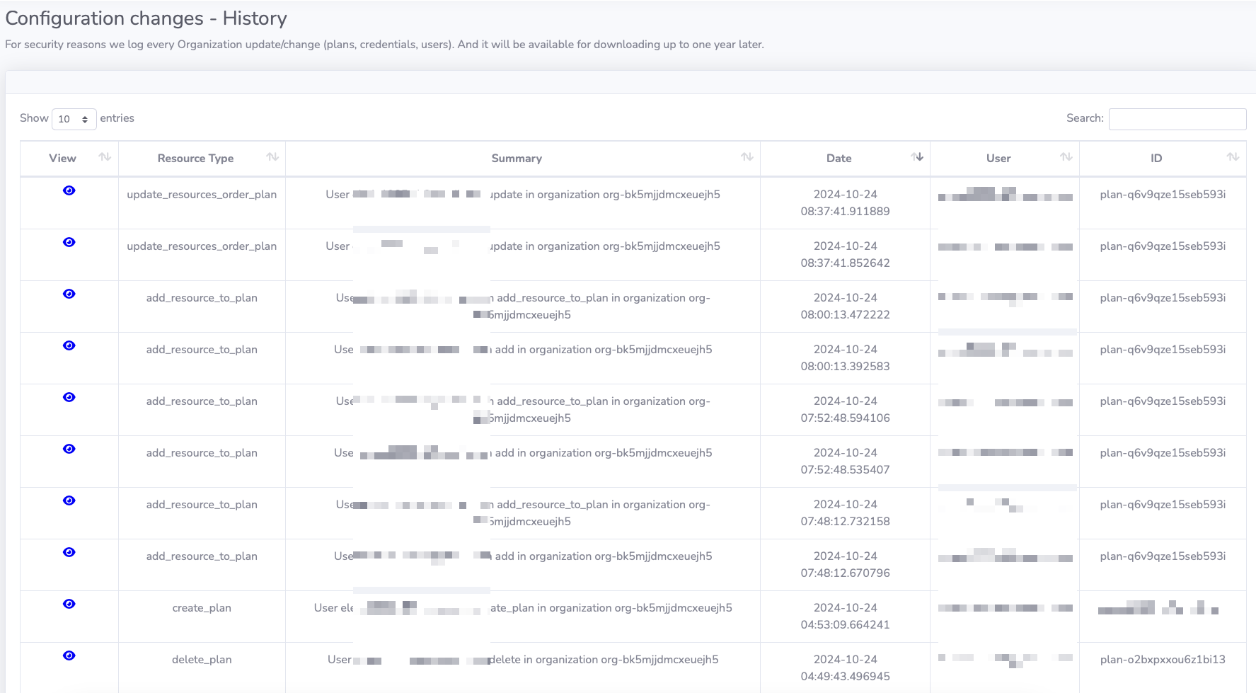 History contains the last 10k activities (create, update or delete resources or configuration) from your Organization.You can download it in CSV format at any time.